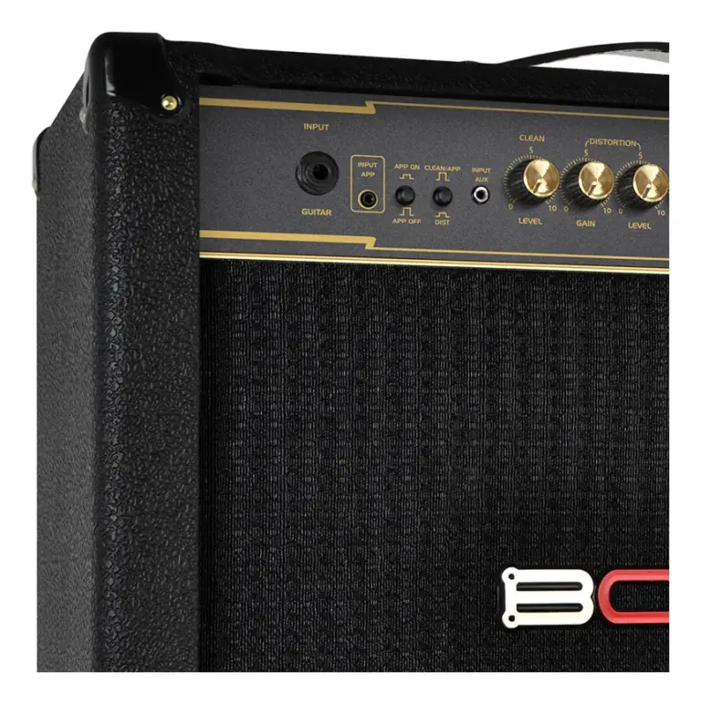 Controle de grave, médio e agudo para o canal limpo, distorção, efeitos app e auxiliar