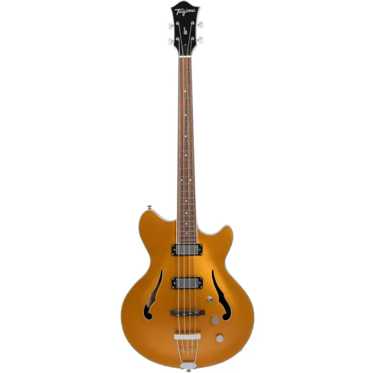 Baixo Tagima Ekosonic Bass GD, com corpo semi-acústico, captação com dois Humbuckers e com case inclusa. No acabamento Gold.
