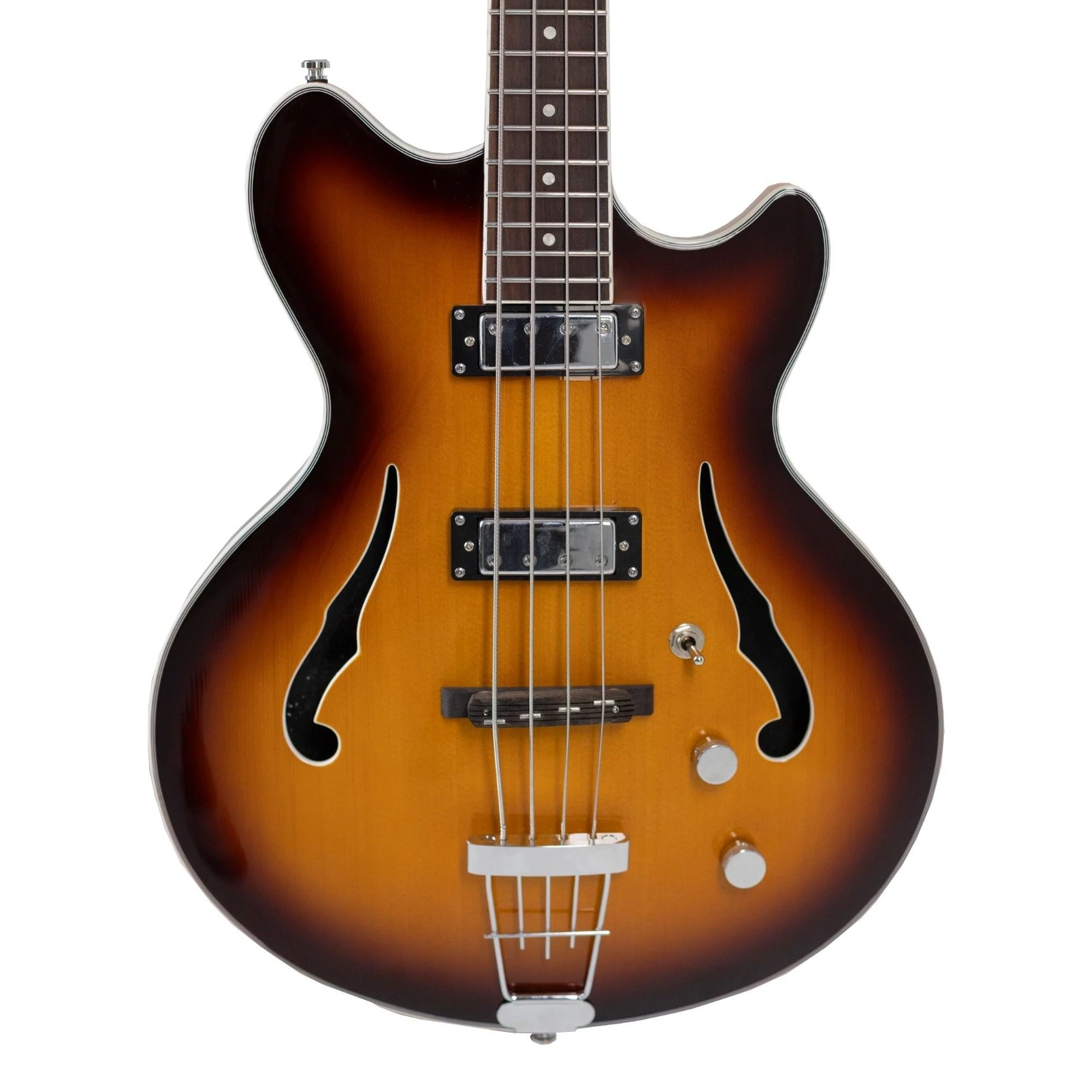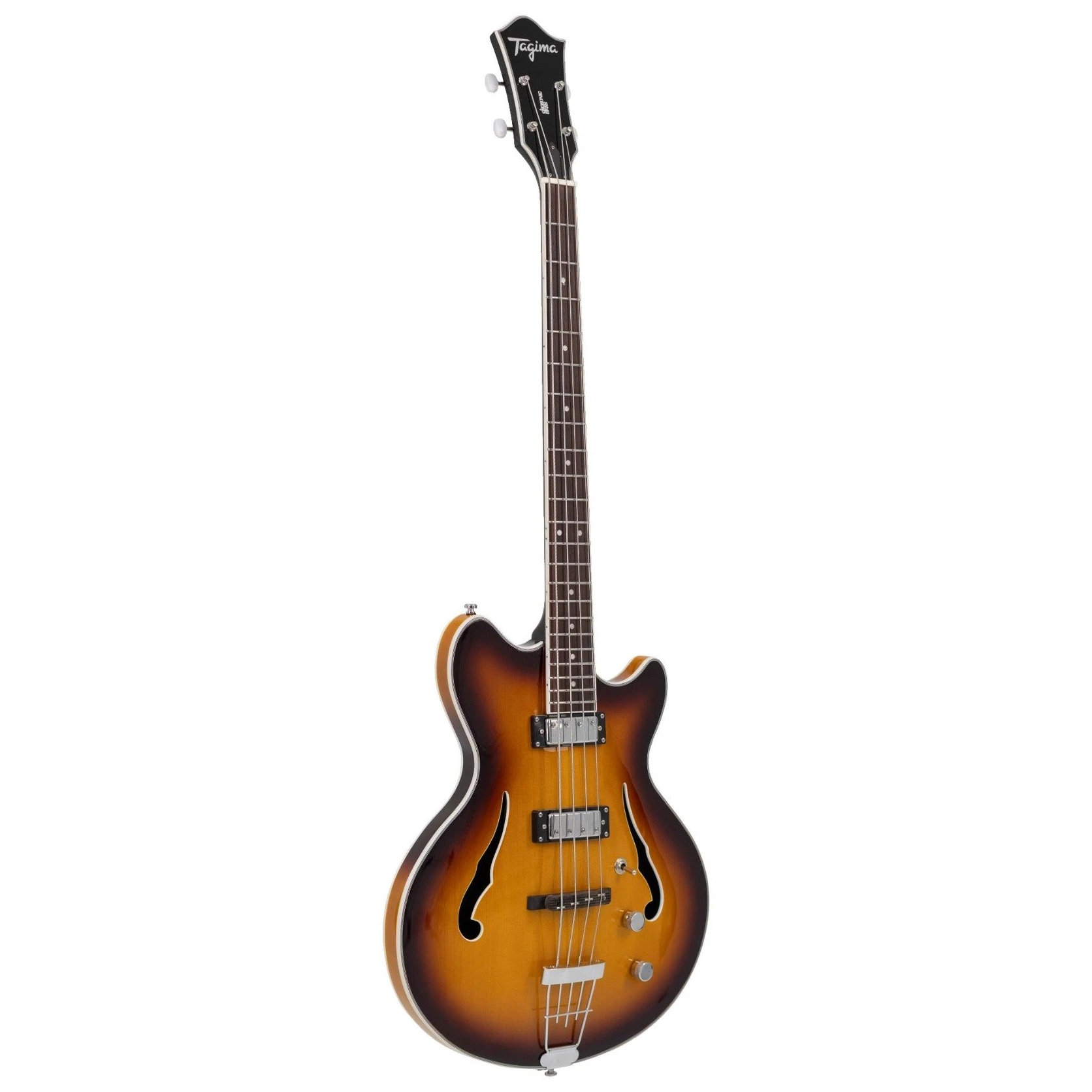 Baixo Tagima Ekosonic Bass SB, com corpo semi-acústico, captação com dois Humbuckers e com case inclusa. No acabamento Sunburst.