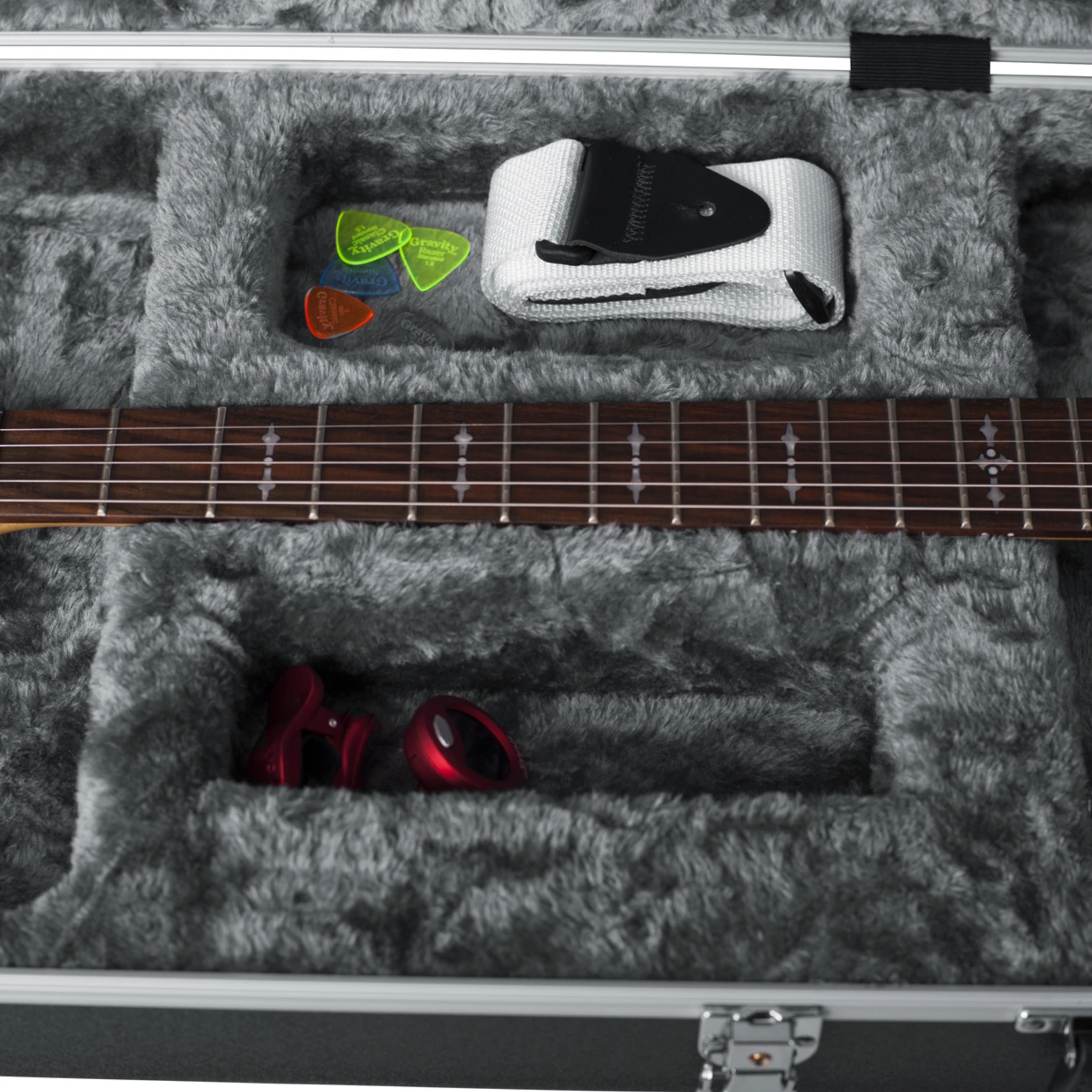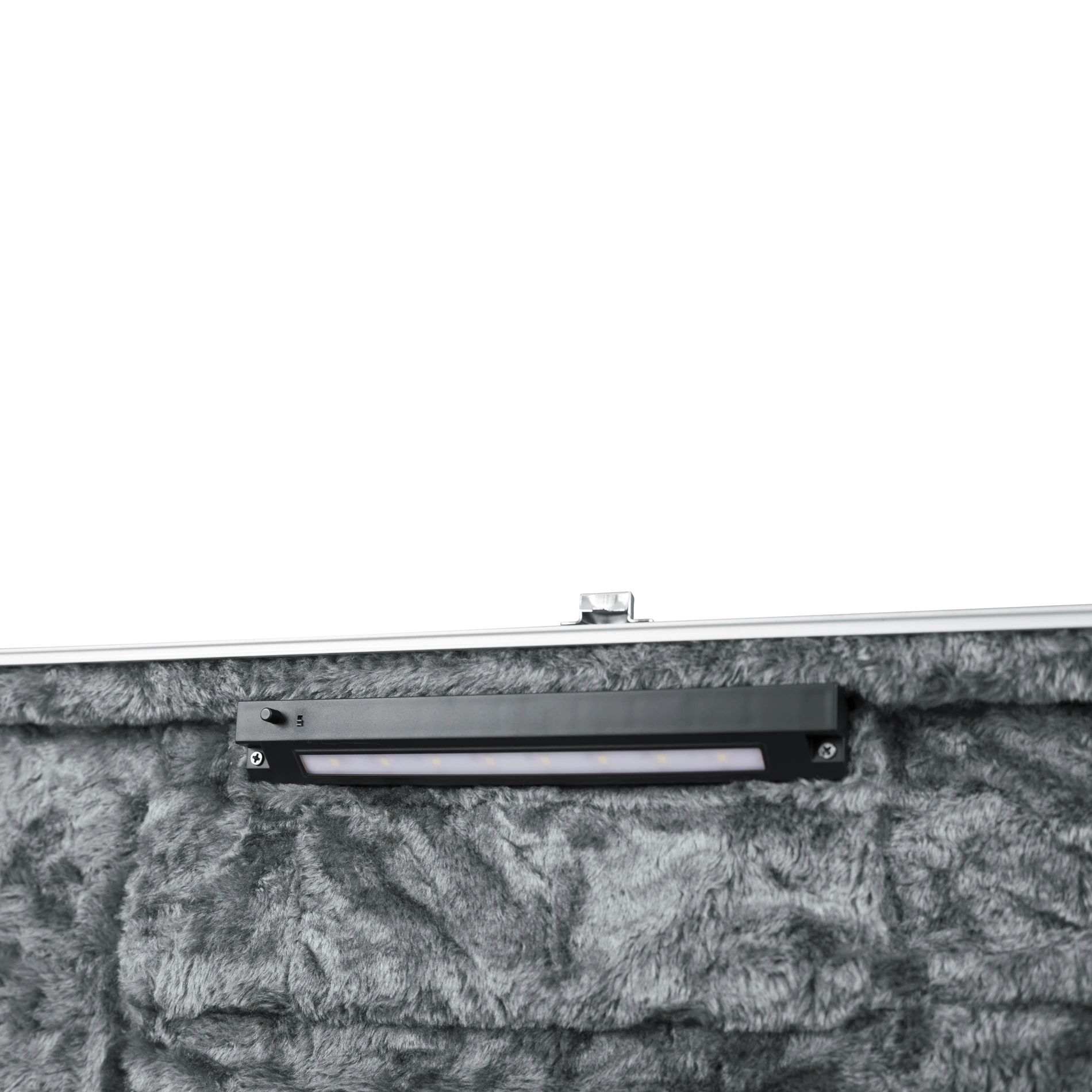 Por dentro, o case conta com estrutura em espuma EPS e revestimento aveludado que mantém sua guitarra elétrica totalmente segura, evitando riscos e absorvendo vibrações. O grande diferencial fica por conta da iluminação LED embutida, localizada na tampa — ao abrir o case, a luz acende automaticamente, iluminando os compartimentos internos para facilitar o acesso a palhetas, capotrastes, correias e cordas, mesmo em ambientes escuros, como backstage ou side stage. Também é possível ligar e desligar o LED manualmente conforme a necessidade.