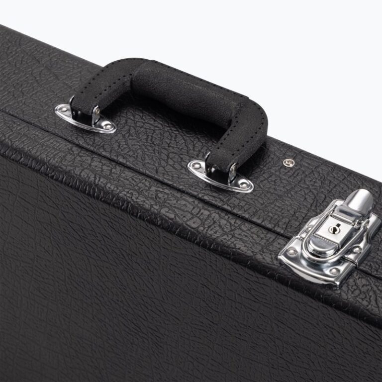 • O case de madeira rígida e o vinil resistente às intempéries protegem o instrumento contra danos e umidade.