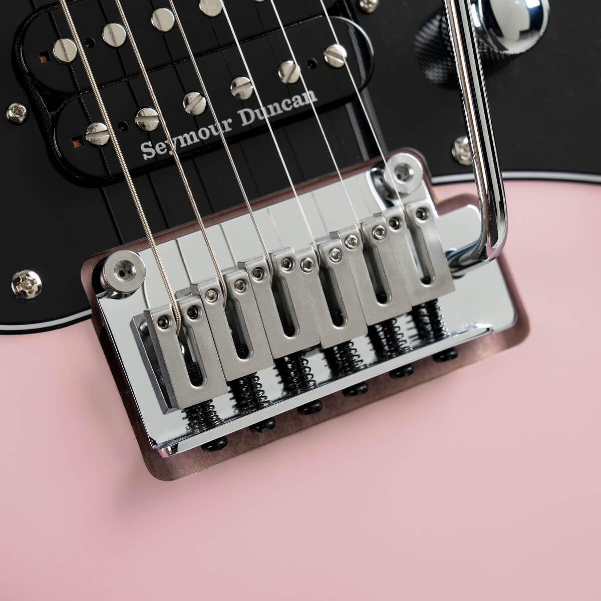 O instrumento utiliza corpo em poplar e braço roasted maple com perfil Ergo V, combinação voltada para estabilidade e resposta rápida. A escala também em roasted maple, com raio composto de 12” a 15.75”, oferece sensação confortável para acordes e liberdade para bends e fraseados mais técnicos. Os 22 trastes stainless steel medium jumbo reforçam a proposta de durabilidade e tocabilidade consistente.