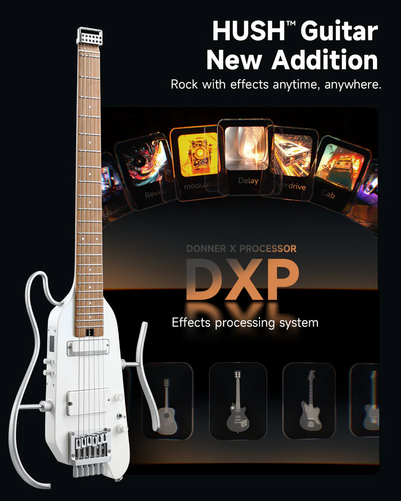 Donner HUSH-X Pro White: guitarra elétrica headless com sistema DXP, corpo em mogno e acabamento branco sofisticado — ideal para estilo e tecnologia.