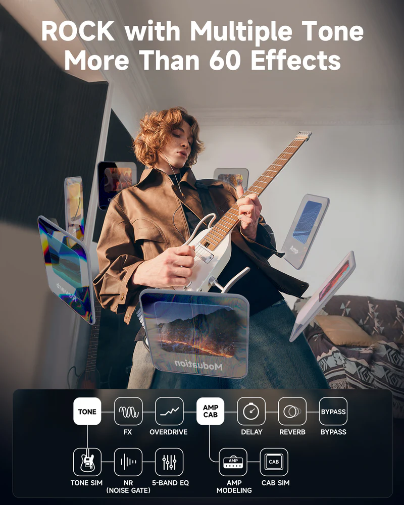 • Efeitos embutidos (drive, delay, reverb, modulação)