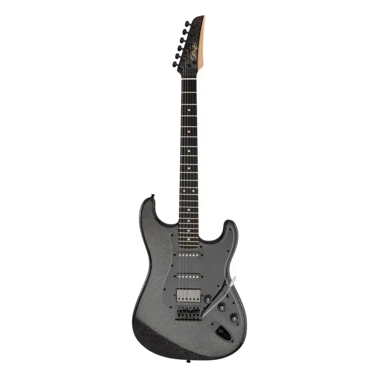 Seizi Fun Katana Musashi, Strato, HSS em Alnico V, ponte 6 parafusos e escala em Purple Heart, corpo na cor All Black Sparkle.