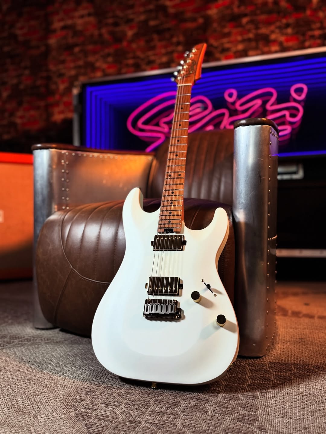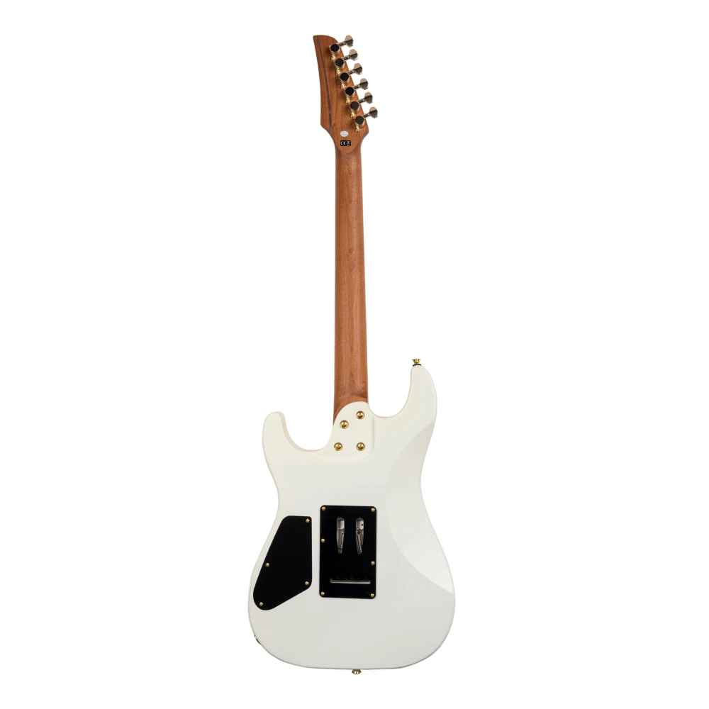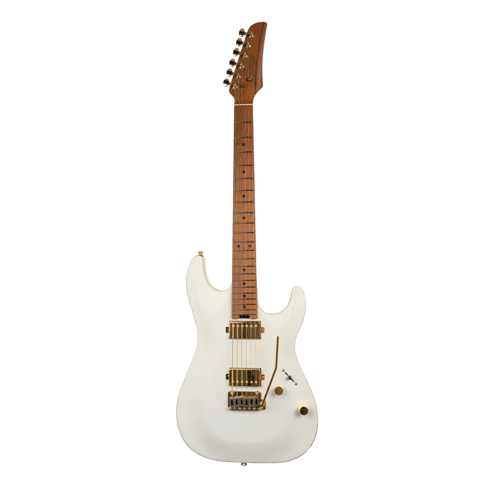 Guitarra Seizi Katana Aura White Storm, estilo Super Strat, com corpo em Mogno, braço e escala em Roasted Maple, trastes em Inox, captação HH em Alnico e acompanha bag.