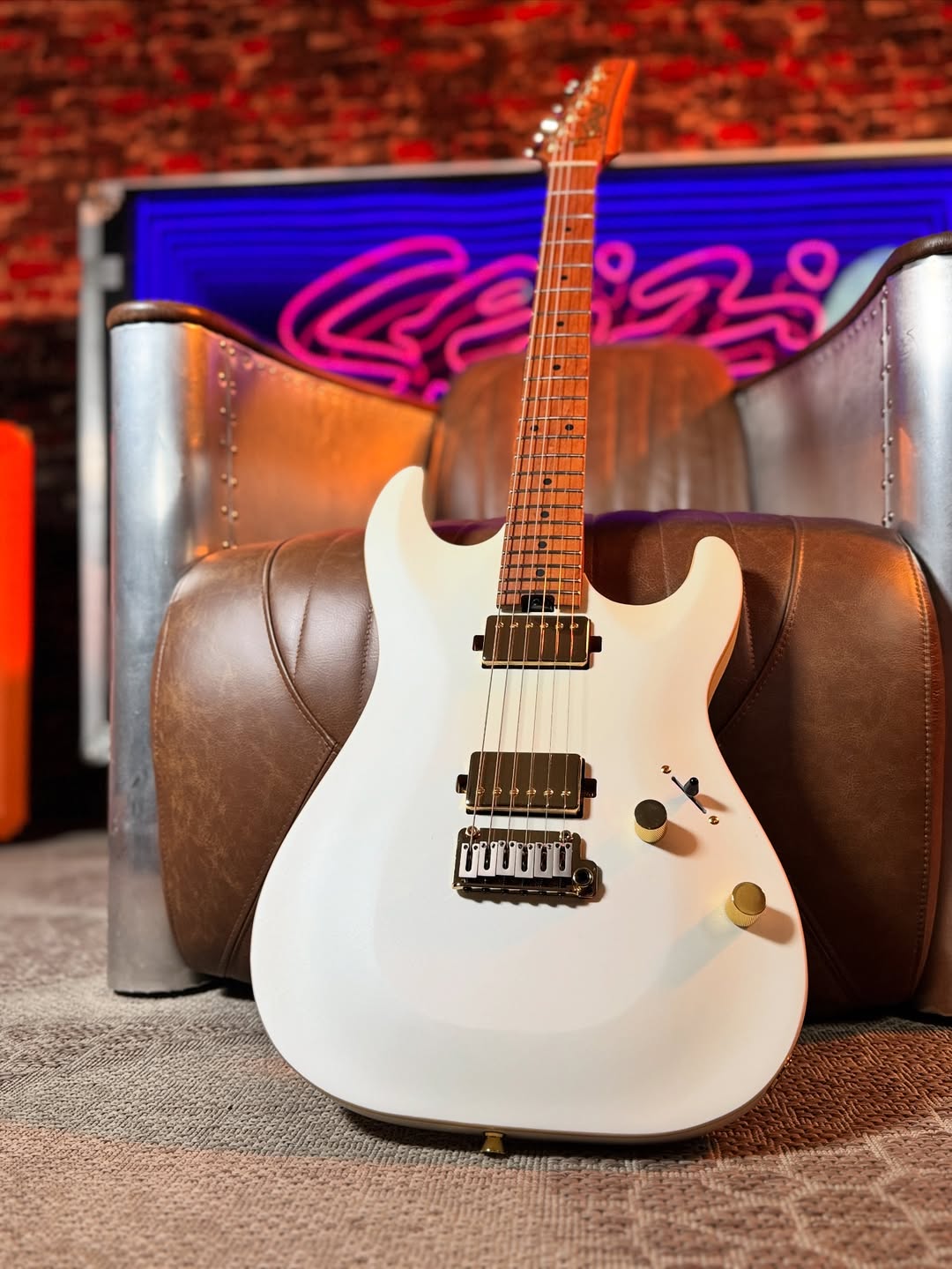 Guitarra Seizi Katana Aura White Storm, estilo Super Strat, com corpo em Mogno, braço e escala em Roasted Maple, trastes em Inox, captação HH em Alnico e acompanha bag. Apresentamos aqui a AURA!! A... ver mais