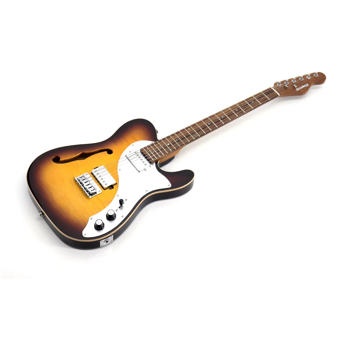 Guitarra Strinberg SGS210T VS, estilo Tele Thin Line, com corpo semi-hollow em Alder e Veneer Top em Flamed Maple, captação HH, braço em Roasted Maple e escala em Pau-Ferro. No acabamento Vintage Sunburst.