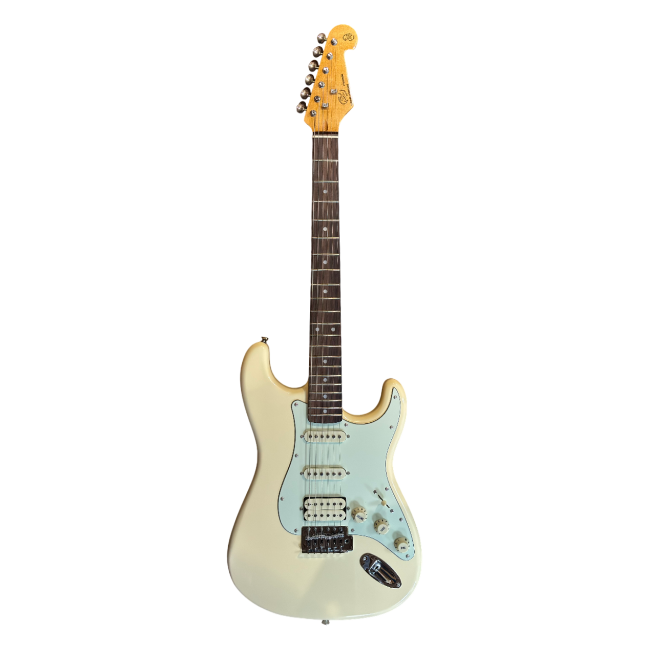 Guitarra SX SST 62 HSS VWH, com corpo em Basswood, braço em Maple, escala em Rosewood, ponte standard tremolo. No acabamento Vintage White.