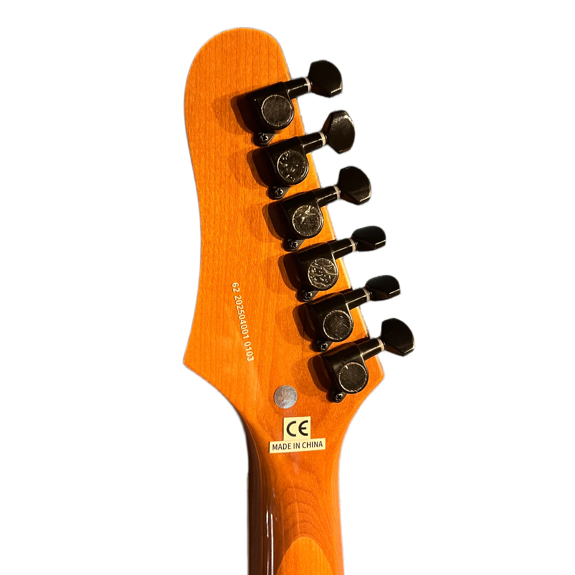 Seu corpo slim em Maple, com tampo, laterais e fundo na mesma madeira, proporciona equilíbrio tonal, sustain consistente e um visual elegante. O braço em Roasted Maple, aliado à escala em Rosewood com 22 trastes, entrega pegada firme, tocabilidade fluida e estabilidade superior, resultado do processo de torrefação da madeira.