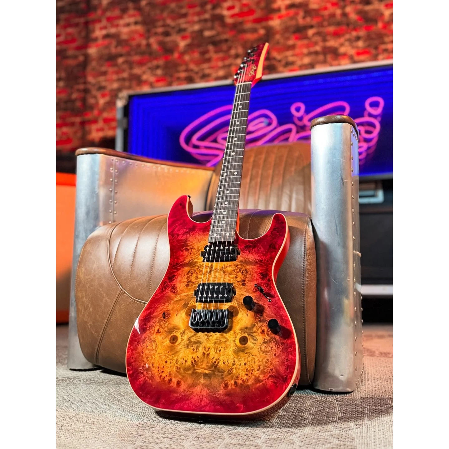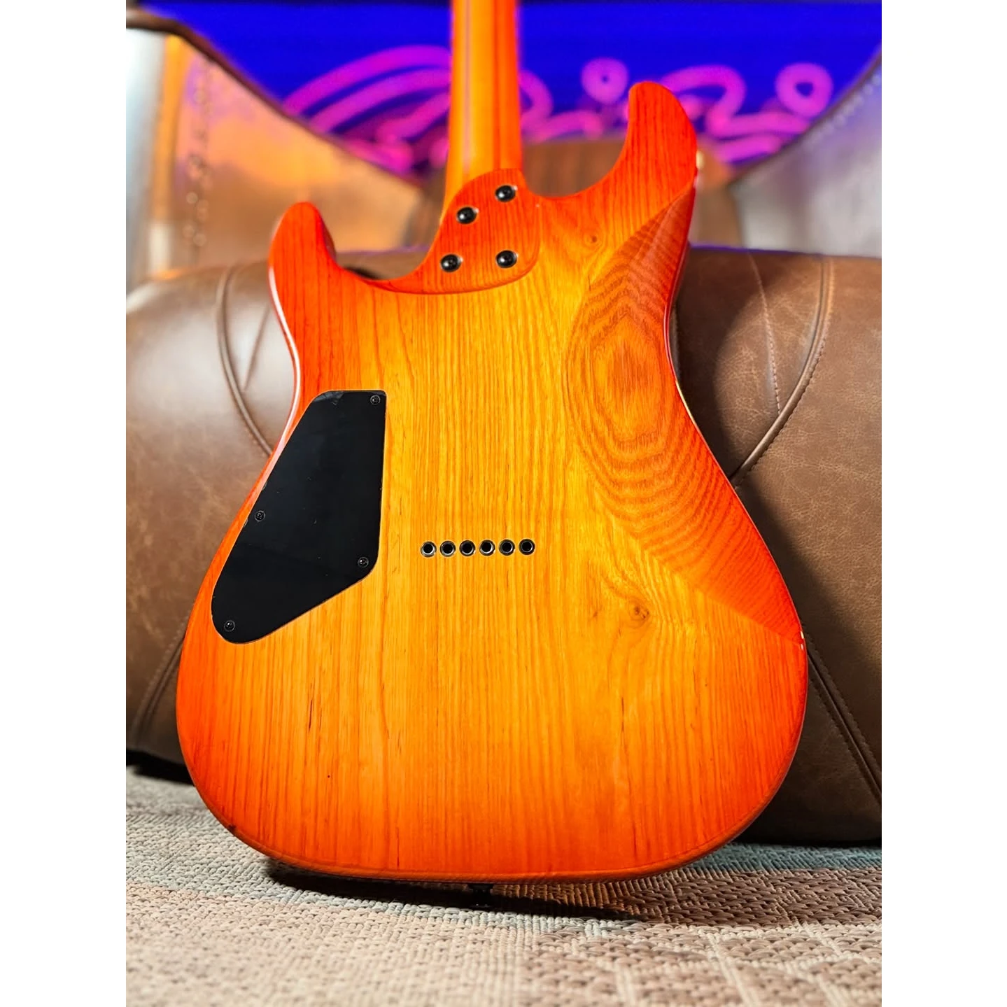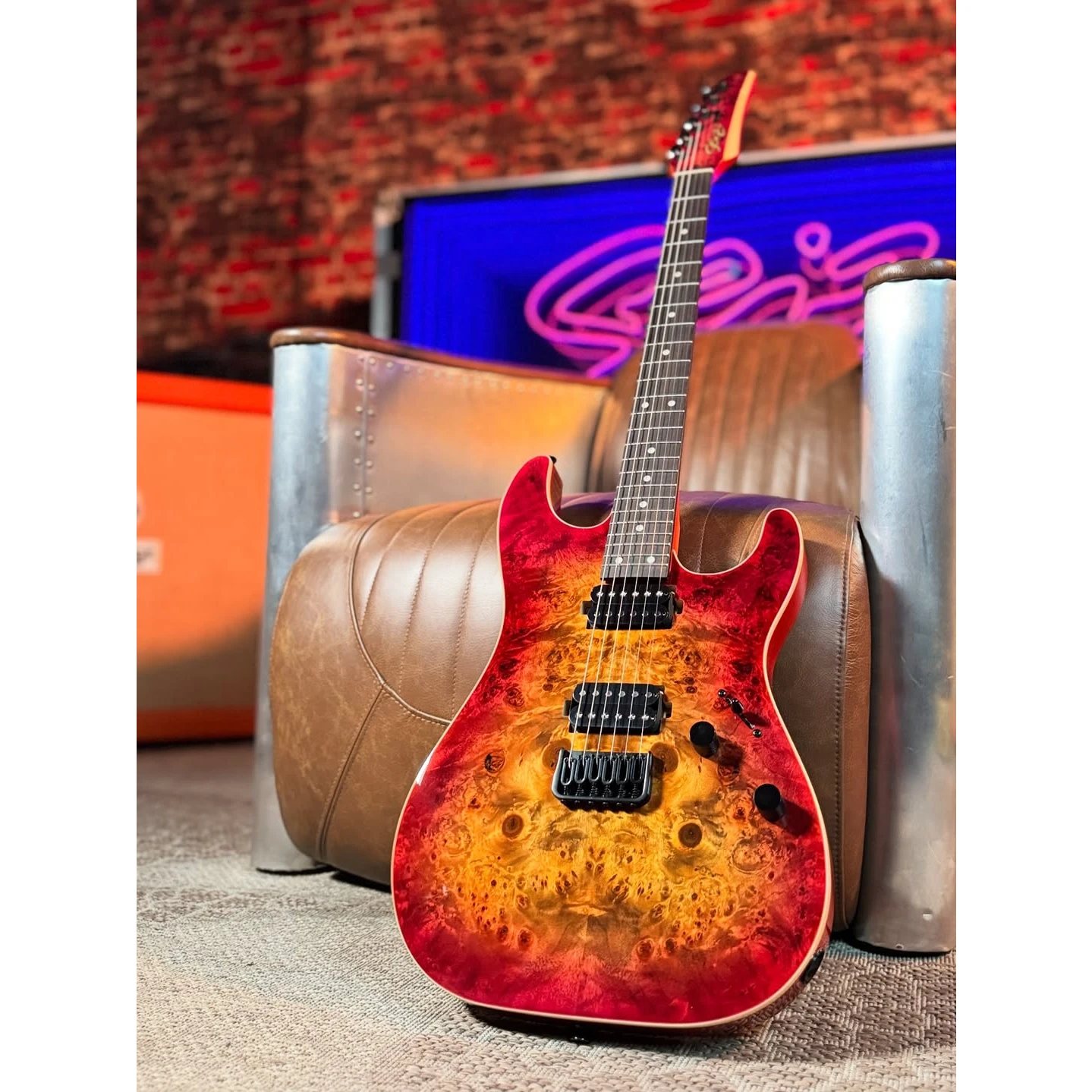 Guitarra Seizi Katana Shadow Ozielzinho Nebula Burst, modelo Signature, estilo Super Strat, com corpo em Mogno, Veneer Top em Quilted Maple, braço em Roasted Maple e escala em Rosewood. Possui tras... ver mais