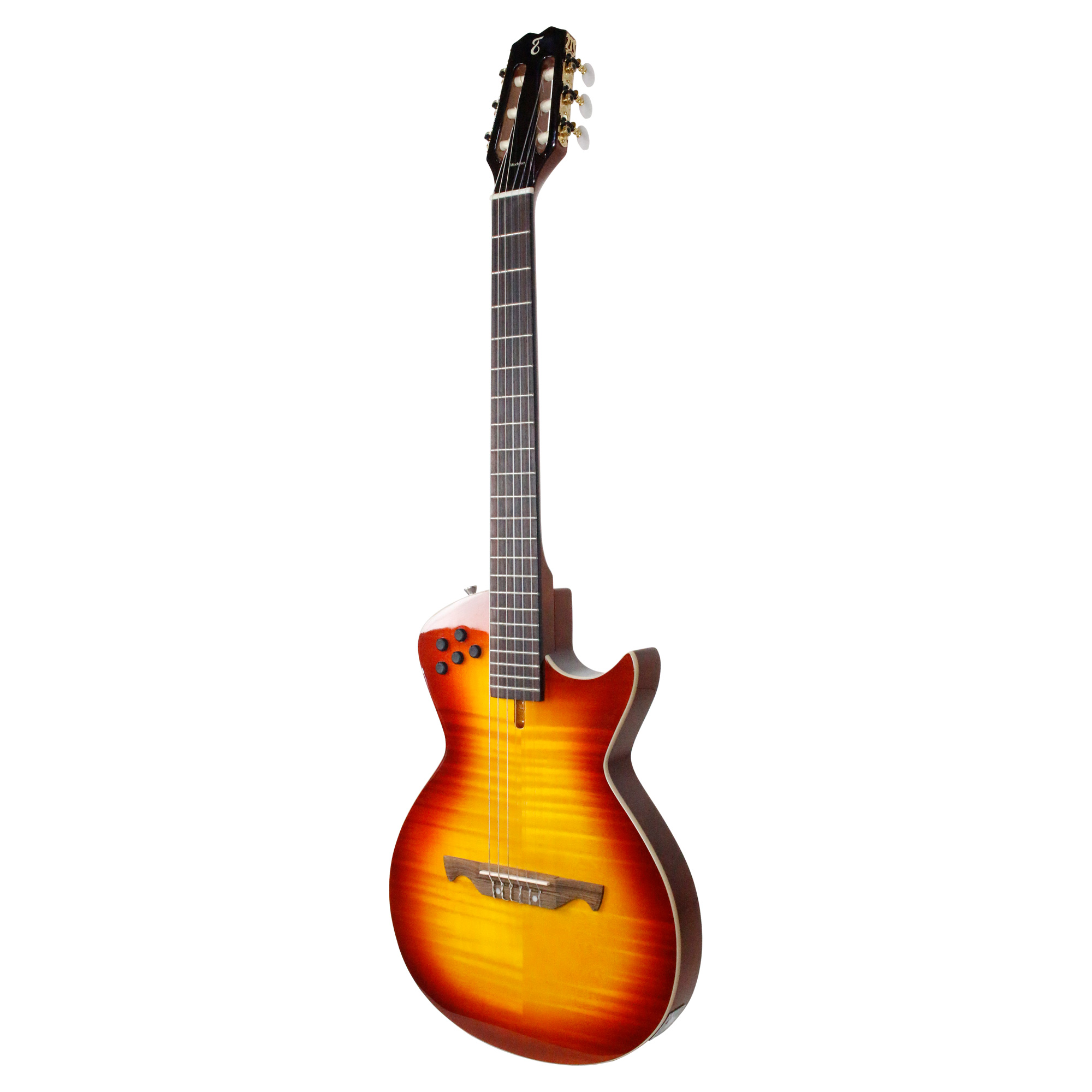 CORPO: Sapele com tone chambers BRAÇO: Okoume – Shape C ESCALA: Rosewood – 22T – C 25.5” – R14 TAMPO: Spruce ou Flamed maple (somente cores TBLF e CB) NUT: Osso CAPTAÇÃO: Piezo TEQ-10 CORES: Cherry Burst (CB) CAVALETE: Chhlik wood EQ: Tagima TEQ-10